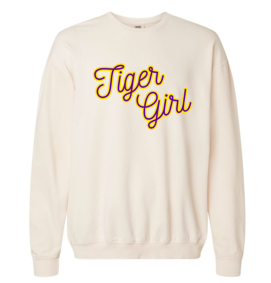 Stay cozy and stylish this fall with the Tiger Girl Purple and Gold Glitter Sweatshirt. Made from 100% lightweight cotton, it offers all-day comfort while showing off your game-day spirit at LSU. Sparkling glitter details add a fun touch to this must-have sweatshirt for every Tigers fan!