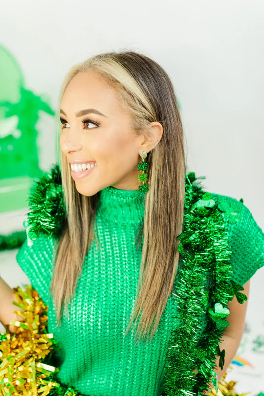 Add some luck to your St. Patrick's Day outfit with our Triple Shamrock Drop Earrings. Crafted from acrylic, these earrings are not only cute but also durable. The unique triple shamrock design is sure to catch everyone's eye. Spread the holiday spirit with these festive earrings.