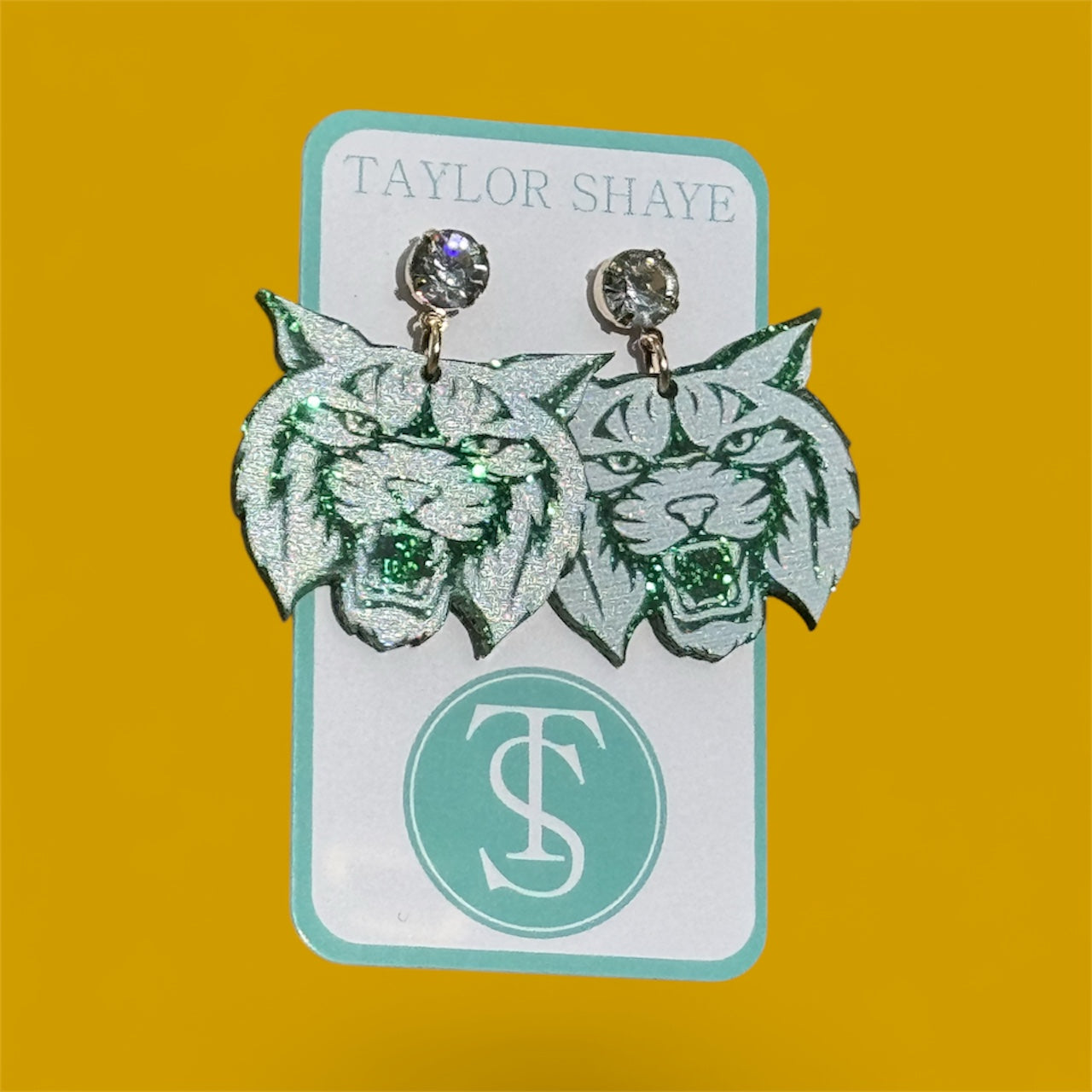 The Wildcat Head Green Glitter Earrings represent a distinctive collaboration between Taylor Shaye Designs and A Vineyard Boutique. Meticulously crafted with shimmering green glitter, these earrings showcase the wildcat head emblem with precision and style. Lightweight and comfortable, they are ideal for fans seeking a sophisticated way to display team spirit while ensuring lasting wear quality.