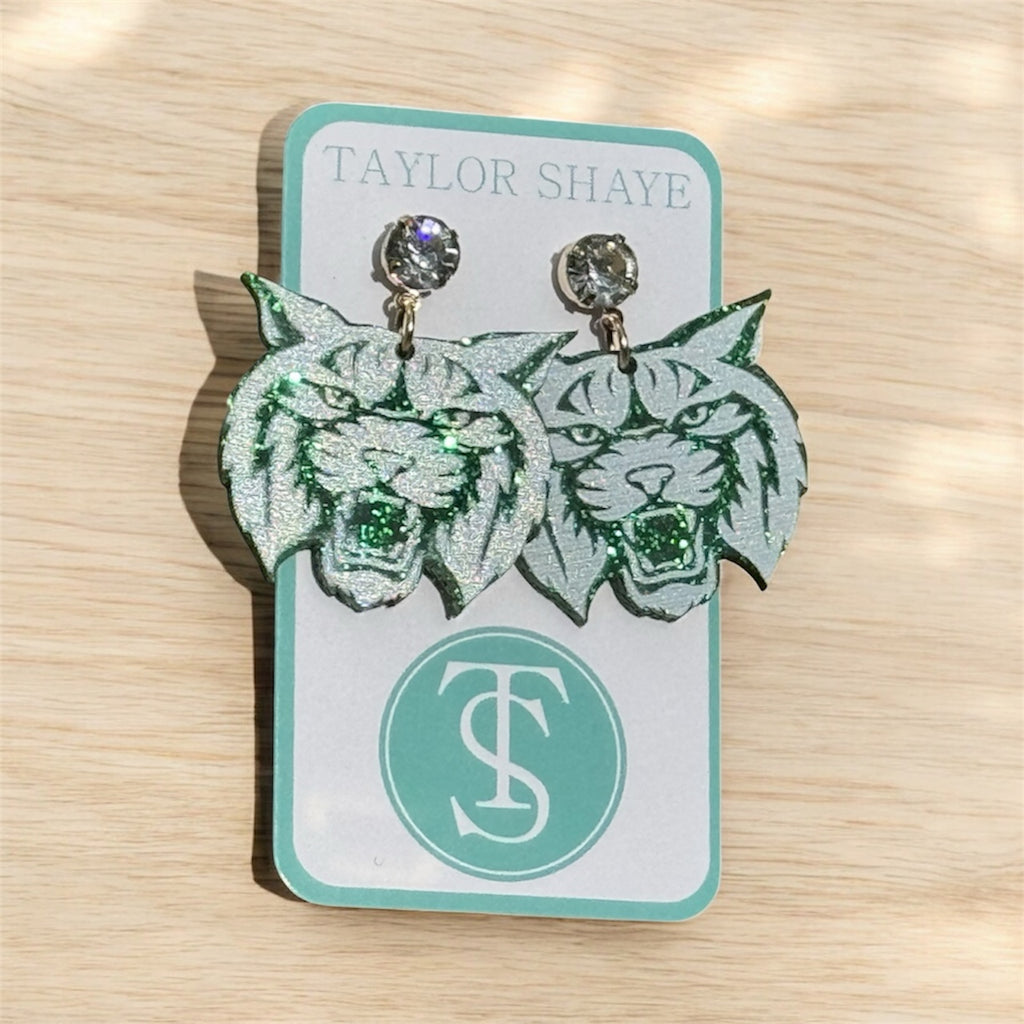 Wildcat Head Green Glitter Earrings