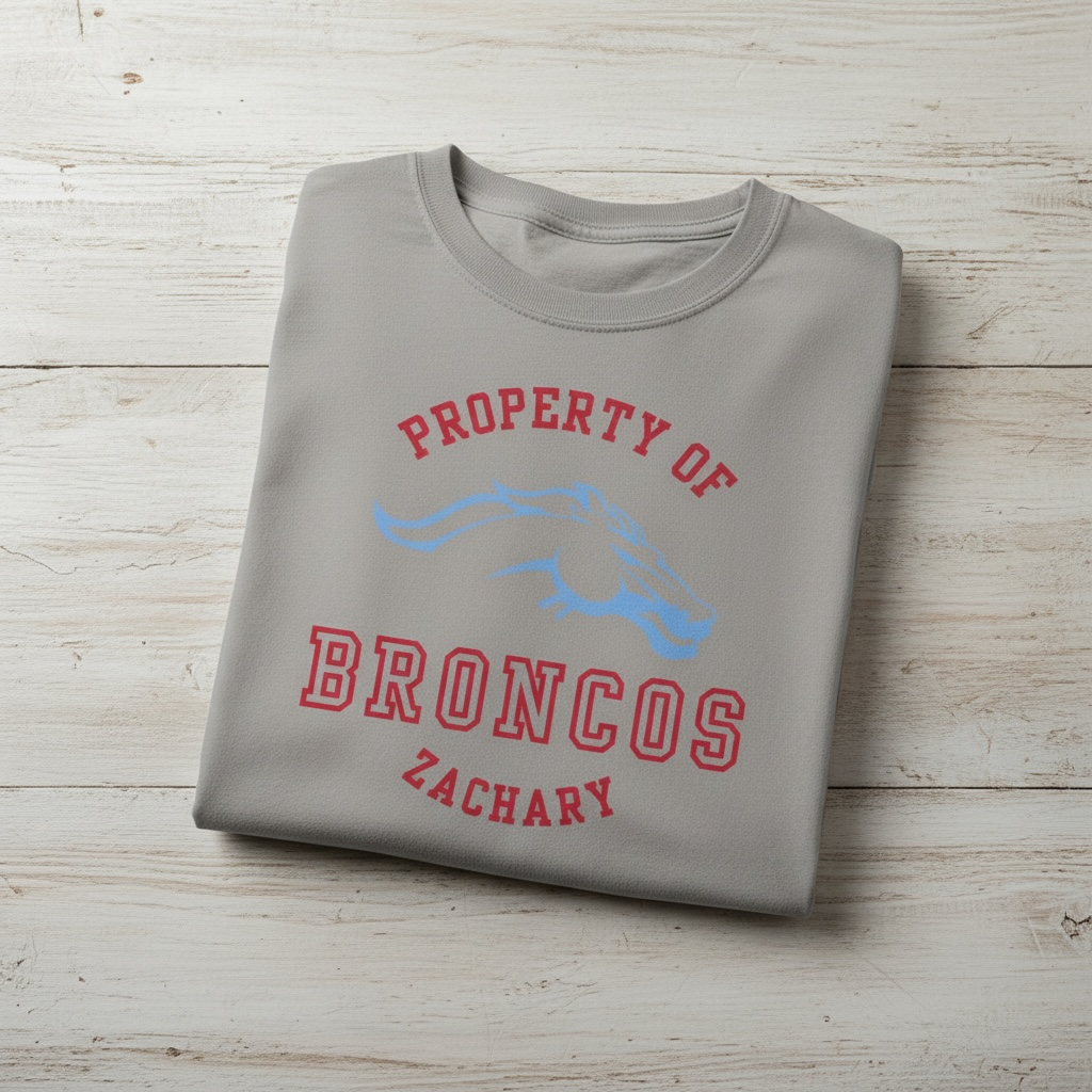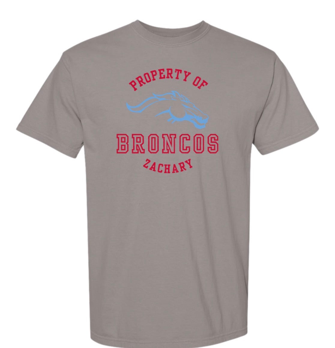 Property of Zachary Broncos T-Shirt in soft grey Comfort Colors fabric. Features a Columbia Blue and Red design. Perfect for game day or everyday wear. Show your Broncos pride with this comfortable, versatile tee that works for fans of all ages.