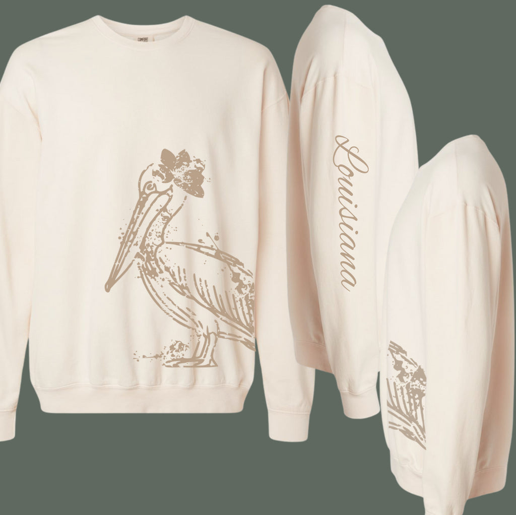 Designed exclusively by A Vineyard Boutique, the Louisiana Pelican Sweatshirt combines a cozy Comfort Colors fabric with a sparkling glitter print. Ideal for fall and winter, it provides both comfort and style, making it a key addition to your seasonal wardrobe with a unique local charm.